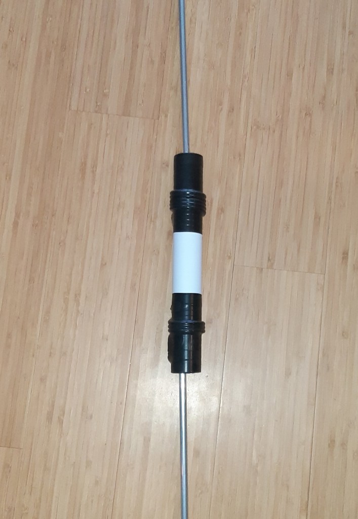In order to accomplish the above in such a short antenna, I added two traps for 15 and 20 meters. These traps were made with stubs of RG58 coax that was wound around a 30 mm PVC plumbing pipe. I did three turns for the 15 meters, five for the 20 meters, and I did the loop trick where the screen on one end loops back to the center lead on the other end.