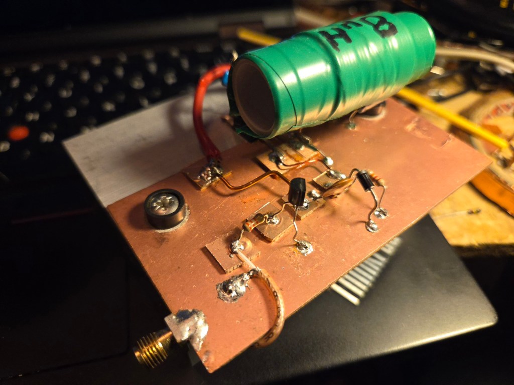 The feedpoint is the SMA connector at the bottom of the image, and is directly connected to the output of the Si5351. This signal lacks the proper oomph to bitchslap the mosfet into action mode, so it first makes a quick detour via a 2N4401 NPN for a quick boost. Keep in mind we’re still dealing with square waves, but considering that we’re building a class E amplifier, that’s actually perfectly fine. No biasing required.