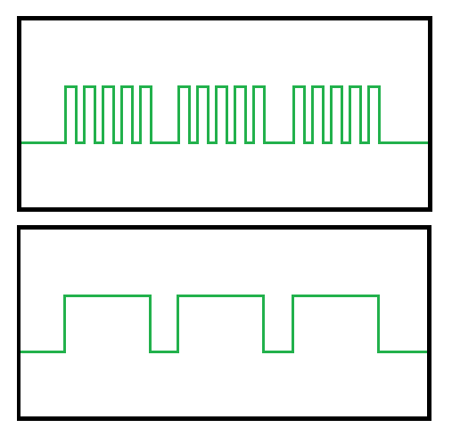 Unfortunately I don’t have any actual pictures showing the oscilloscope, so to illustrate the issue you’ll have to trust my MS Paint skills. This shows the RF signal before (top) the NPN, and after (bottom):